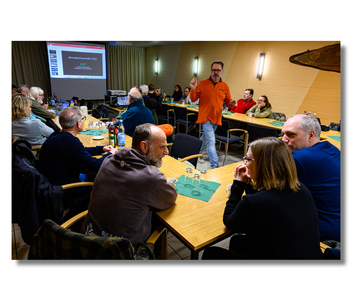 Trotz des gut gefüllten Raumes war die Stimmung sehr entspannt – wie immer bei unseren Treffen. Zu Beginn gab es einen Rückblick über die Veranstaltungen des letzten Jahres in einer Power Point-Präsentation: vier Regionalgruppentreffen, das GDT-Mitgliedertreffen im Frühjahr, das internationale Naturfototreffen in Lünen Ende Oktober und die digital durchgeführte Mitgliederversammlung im November. Wie in jedem Jahr gab es eine Auswertung der Bücher des ENJ und der Wildlife Fotografien des Jahres, welche Kamerasysteme verwendet wurden. Wie in den letzten Jahren liegen Nikon, Canon und mit Abstand Sony auf den ersten Plätzen. Alle anderen Systeme spielen nur eine untergeordnete Rolle. An den verwendeten Kameras kann man erkennen, dass immer mehr Systemkameras eingesetzt werden. Zum Schluss der Präsentation wurde auch über das Programm 2025 gesprochen und mögliche Ziele für die nächsten Treffen vorgestellt.